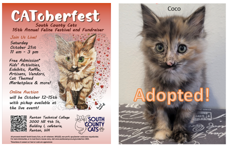 Visit https://www.southcountycats.org/catoberfest-2023-info to see Coco's full story and read about our "Mom's Last Litter" kitten Bisque.